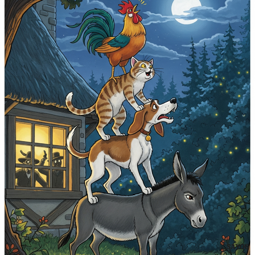 해가 저물 무렵, 그들은 숲 속에서 불빛이 새어 나오는 집을 발견했습니다. 안을 들여다보니, 도둑들이 훔친 보물을 앞에 두고 잔치를 벌이고 있었습니다. 배고프고 지친 동물들은 도둑들을 내쫓고 그 집을 차지할 방법을 고민했습니다.